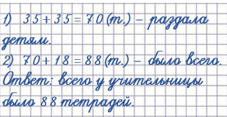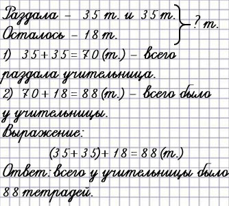 10. Учительница раздала детям 35 тетрадей в клетку и столько же в линейку. После этого у неё осталось 18 тетрадей. Сколько тетрадей было у учительницы?
