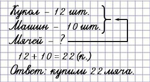 14. Для детского сада купили 12 кукол, 10 заводных машин, а мячей столько, сколько кукол и машин вместе. Сколько купили мячей?