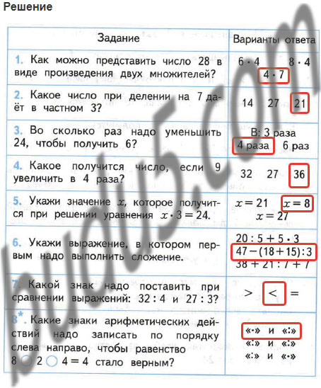7. Какой знак надо поставить при сравнении выражений: 32 : 4 и 27 : 3? |