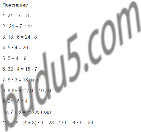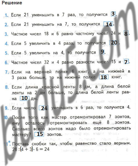 1. Если 21 уменьшить в 7 раз, то получится 2. Если 21 уменьшить на 7, то получится 3. Частное чисел 18 и 6 равно частному чисел 24 и 4. Если 5 увеличить в 4 раза, то получится 5. Если 5 увеличить на 4, то получится 6. Частное чисел 32 и 4 равно разности чисел 15 и 7. Если на верхней полке 6 книг, а на нижней в 3 раза больше, то на нижней полке 8. Если длина красной ленты 8 дм, а длина белой ленты на 2 дм больше, то длина белой ленты равна 9. Если число 10. После того как мастер отремонтировал 7 зонтов, ему осталось отремонтировать ещё 8 зонтов. Сколько всего зонтов надо было отремонтировать мастеру? 11*. Поставь скобки так, чтобы равенство стало верным. 28 : 4 + 3 • 6 = 24 |