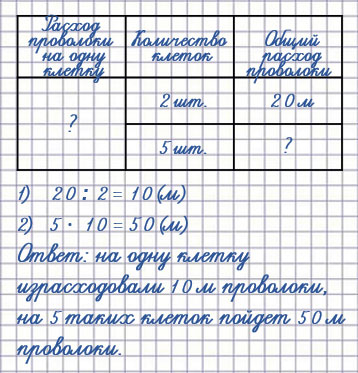 3. На 2 одинаковые клетки для птиц израсходова­ли 20 м проволоки. Сколько метров проволоки израсходовали на одну клетку? Сколько метров проволоки пойдёт на 5 таких клеток?