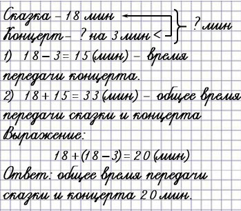 4. По радио передавали сказку 18 мин, а концерт на 3 мин меньше. Объясни, что означают выражения: