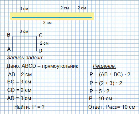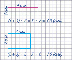 Периметр 1: (3 + 2) • 2 = 5 • 2 = 10 (см)