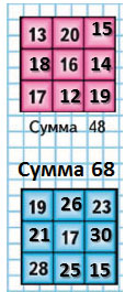 Синий квадрат не магический, потому что сумма 68 во всех линиях, кроме одной.