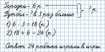 1. В городки играли 6 ребят, а в футбол — в 3 раза больше. Сколько всего ребят играло в эти игры?