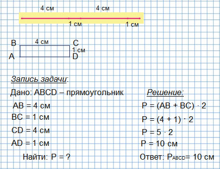 Периметр 2: (1 +4) • 2 = 5 • 2 = 10 (см)