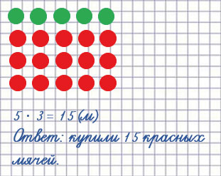 Купили 5 зелёных мячей, а красных в 3 раза больше. Сколько красных мячей купили?