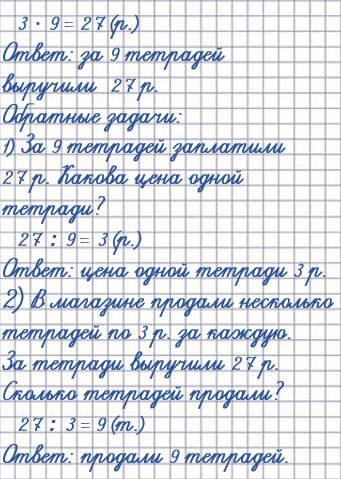 2. 1) В магазине продали 9 тетрадей по цене 3 р. за каждую. Сколько денег выручили за эти тетради?