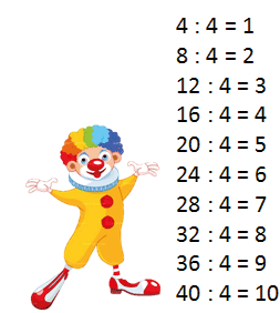 4 : 4 = 1 8 : 4 = 2 12 : 4 = 3 16 : 4 = 4 20 : 4 = 5 24 : 4 = 6 28 : 4 = 7
