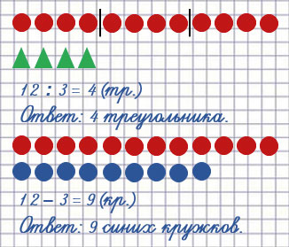 В первый ряд положили 12 кружков, а во второй ряд надо положить в 3 раза меньше треугольников. Разделим 12 кружков на 4 равные части. Треугольников должно быть столько, сколько кружков в одной части.