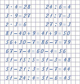 | 7 • 4 = 28 | 81 - 40 + 9 = 50 |