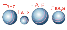 Раз у Люды мяч меньше, чем у Ани и Тани, но не самый маленький, значит самый маленький мяч - у Гали, а у Люды - следующий по величине.