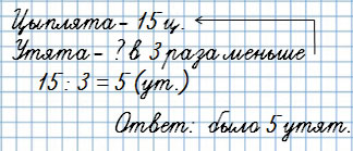 У хозяйки 15 цыплят, а утят в 3 раза меньше. Сколько утят у хозяйки?