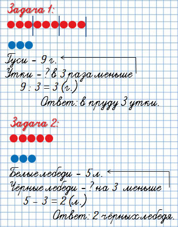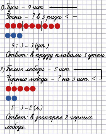 1) В пруду плавало 9 гусей, а уток в 3 раза меньше. Сколько уток плавало в пруду?