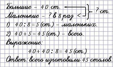 1) В мастерской изготовили 40 больших столов, а маленьких в 8 раз меньше, чем больших. Сколько всего столов изготовили?
