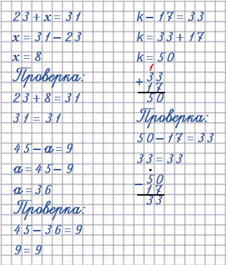 23 + = 31     k - 17 = 33    45 - = 9