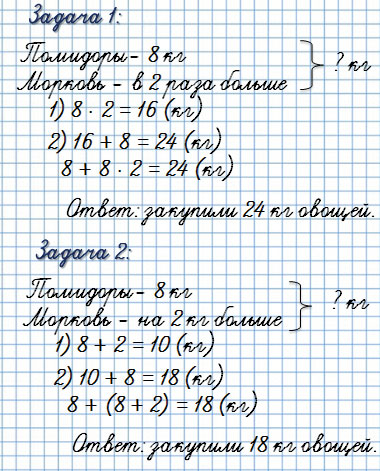 В заводскую столовую закупили 8 кг помидоров, а моркови в 2 раза больше, чем помидоров Сколько всего килограммов овощей закупили?