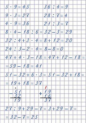 28 : 7 = 4 51 - 32 + 6 • 3 = 37