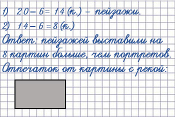 7. В зале музея выставили 20 картин, из них 6 портретов, остальные - пейзажи. На сколько больше выставили пейзажей, чем портретов?