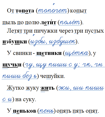 1. От топота (___) копыт пыль по полю летит (___). 2. Летят три пичужки через три пустых избушки (___). 3. У свинки - щетинки (___), у щучки (___) - чешуйки. 4. Жутко жуку жить (___) на суку. 5. У пеньков (___) опять пять опят.
