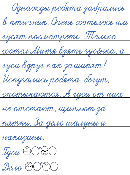 Однажды р..бята забрались в птичник. Очень хотелось им гусят посмотреть. Только хотел Митя взять гусёнка, а гуси вдру.. как зашипят! Испугались р..бята, бегут, спотыкаются. А гуси от них не отстают, щиплют за пятки. За дело шалуны и наказаны.