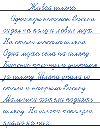 Однажды к..тёнок Васька сидел на п..лу и ловил мух. На ст..ле лежала шляпа. Одна муха села на шляпу. К..тёнок прыгнул и уц..пился за шляпу. Шляпа упала со ст..ла и накрыла Ваську. Мальчики х..тели поднять шляпу. Но шляпа поп..лзла прямо на них.