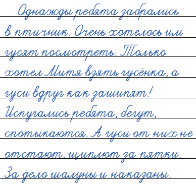 Однажды р..бята забрались в птичник. Очень хотелось им гусят посмотреть. Только хотел Митя взять гусёнка, а гуси вдруг как заш..пят! Испугались р..бята, бегут, спотыкаются. А гуси от них не отстают, щиплют за пятки. За дело шалуны и наказаны.