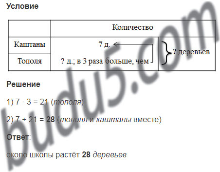 Около школы растут каштаны и тополя. Каштанов растёт семь, а тополей - в 3 раза больше. Сколько деревьев растёт около школы?