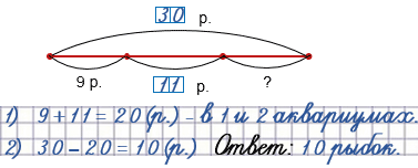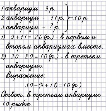36. В трёх аквариумах 30 рыбок. В первом аквариуме 9 рыбок, а во втором — 11. Сколько рыбок в третьем аквариуме?