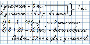 1) С одного участка собрали 8 кг кабачков, а с другого — в 3 раза больше. Сколько всего килограммов кабачков собрали с двух участков?