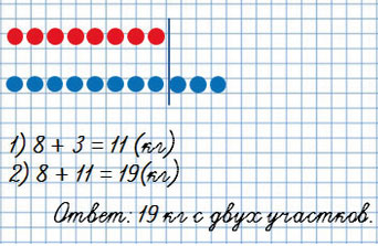2) С одного участка собрали 8 кг кабачков, а с другого — на 3 кг больше. Сколько всего килограммов кабачков собрали с двух участков?