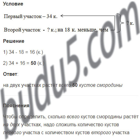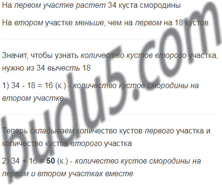 На одном участке растут 34 куста смородины, а на другом - на 18 кустов меньше. Сколько всего кустов смородины растёт на двух участках?