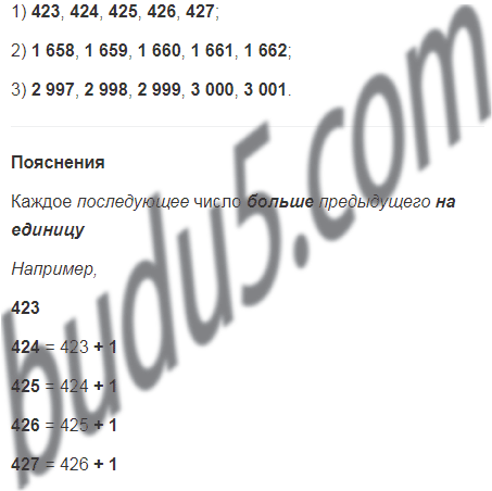 Назовите пять последовательных натуральных чисел, начиная с числа: 1) 423; 2) 1 658; 3) 2 997.
