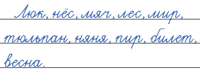 Люк, нёс, мяч, лес, мир, тюльпан, няня, пир, магазин, матч, лужайка, табуретка, ноябрь, поезд, билет, вода, бутон, весна.