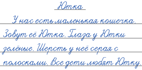 Глаза у Ютки зелёные. У нас есть маленькая кошечка. Шерсть у Ютки серая с полосками. Зовут нашу кошку Ютка. Все дети любят Ютку.