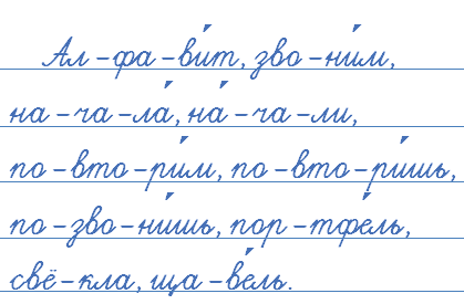 Алфавит, звоним, позвонишь, начали, начала, портфель, свёкла, щавель, повторишь, повторим.
