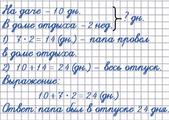 3. Папа провёл 10 дней своего отпуска на даче, а остальные 2 недели в доме отдыха. Сколько дней папа был в отпуске?
