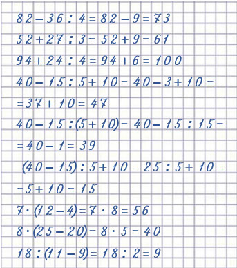 82 - 36 : 4 = 73 1) 36 : 4 = 9 2) 82 - 9 = 73 |