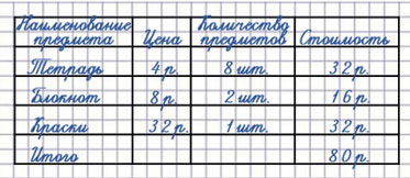 1) Посчитай, хватит ли 100 р., чтобы купить 8 таких тетрадей, 2 блокнота и 1 набор красок, если 1 тетрадь стоит 4 р.