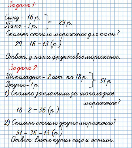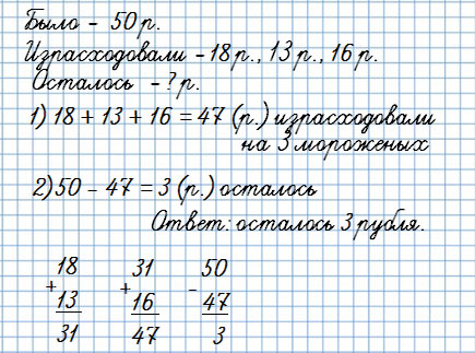 2. 1) Папа купил детям шоколадное, фруктовое и ванильное мороженое, по одному каждого сорта. Сколько сдачи он должен получить с 50 р.?