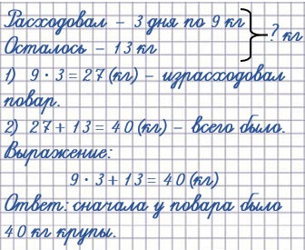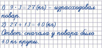 23. Повар 3 дня расходовал по 9 кг крупы. После этого у него осталось 13 кг крупы. Сколько крупы было у повара сначала?