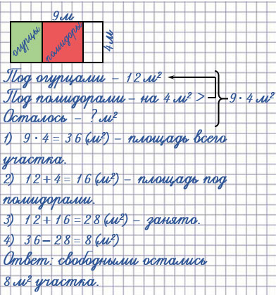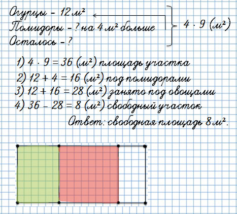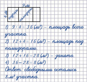 32. Начерти план участка прямоугольной формы со сторонами 4 м и 9 м, изображая 1 м² одной клеткой. Покажи на плане, что огурцами занято 12 м², а помидорами - на 4 м² больше, чем огурцами. Сколько квадратных метров участка остались свободными?