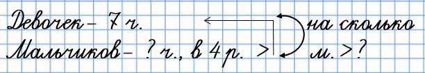 4. В школьном оркестре 7 девочек, а мальчиков в 4 раза больше, чем девочек. Задай вопрос к условию задачи так, чтобы получить ответ: на 21 мальчика. Запиши решение.