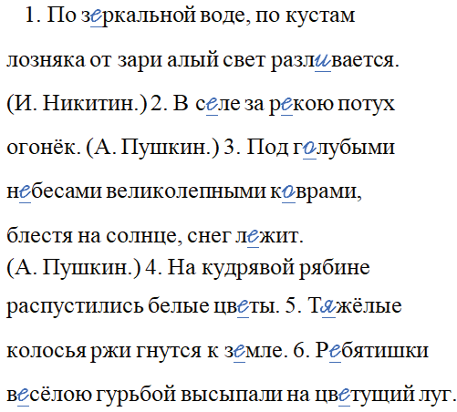 1. По з..ркальной воде, по кустам лозняка от зари алый свет разл..вается. (И. Никитин.) 2. В с..ле за р..кою потух огонёк. (А. Пушкин.) 3. Под г..лубыми н..бесами великолепными к..врами‚ блестя на солнце, снег л..жит. (А. Пушкин.) 4. На кудрявой рябине распустились белые цв..ты. 5. Т..жёлые колосья ржи гнутся к з..мле. 6. Р..бятишки в..сёлою гурьбой высыпали на цв..тущий луг.