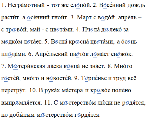 1. Неграмотный - тот же сл_пой. 2. В_сенний дождь растит, а _сенний гноит. 3. Март с в_дой‚ апрель - с тр_вой‚ май - с цв_тами. 4. Пч_ла д_леко за м_дком л_тает. 5. В_сна кр_сна цв_тами‚ а ос_нь - пл_дами. 6. Апрельский цв_ток л_мает сн_жок. 7. М_теринская ласка к_нца не знает. 8. Много г_стей, много и н_востей. 9. Т_рпенье и труд всё перетрут. 10. В руках мастера и кр_вое полено выпр_мляется. 11. С м_стерством люди не р_дятся, но добытым м_стерством г_рдятся.