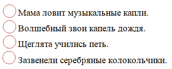 Учились щеглята петь. Плохо у них ещё получалось. Z Однажды после грозы в лесу заиграла музыка. Это дождевые капли, стекая с ветвей, падали в лужи и рассыпались волшебным звоном. Z Тогда мама-учительница стала подхватывать на лету музыкальные капли и носить их в гнездо своим детям. Щеглята широко раскрывали клювы, и в их горлышках звенели серебряные колокольчики.