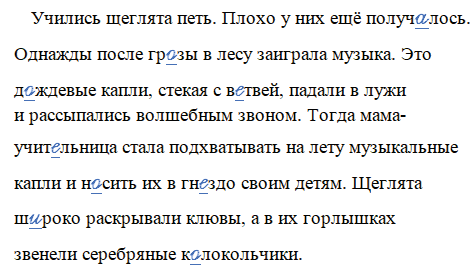Учились щеглята петь. Плохо у них ещё получ_лось. Однажды после гр_зы в лесу заиграла музыка. Это д_ждевые капли, стекая с в_твей, падали в лужи и рассыпались волшебным звоном. Тогда мама-учит_льница стала подхватывать на лету музыкальные капли и н_сить их в гн_здо своим детям. Щеглята ш_роко раскрывали клювы, а в их горлышках звенели серебряные к_локольчики.