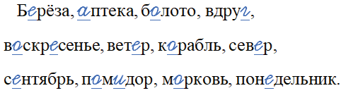 Бе-рё-за, а-пте-ка, бо-ло-то, вдруг, во-скре-сень-е, ве-тер, ко-рабль, се-вер, сен-тябрь, по-ми-дор, мор-ковь, по-не-дель-ник.