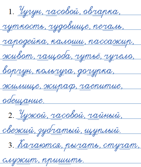 Чужой, чугун, качаются, рычать, чайный, часовой, овчарка, чуткость, чудовище, печаль, стучат, чародейка, калоши, пассажир, служит, живот, чащоба, чутьё, чучело, ворчун, кольчуга, дочурка, свежий, жилище, жираф, пришить, чаепитие, зубчатый, щуплый, обещание.