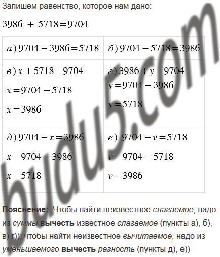 Сумма 3986 + 5718 равна 9704. Пользуясь этим, найдите без вычислений значение выражения или корень уравнения: